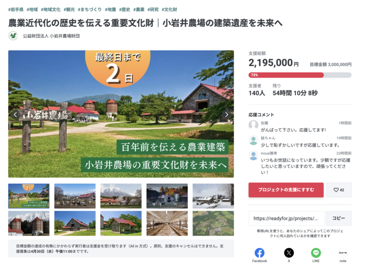 平素より小岩井農場の歴史的建造物保存活動に温かなご支援を賜りまして、心より御礼申し上げます。クラウドファンディングもいよいよ残り2日となりました。