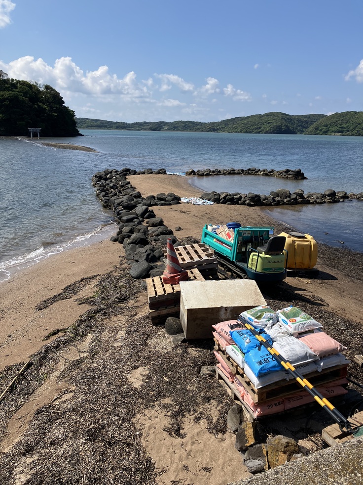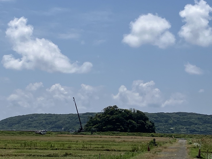 今朝、現場では大型クレーンが建設資材を堤防下の資材プールに吊り下ろしていました。資材プールからは引き潮の間を利用して小島神社参道に運搬するそうです。