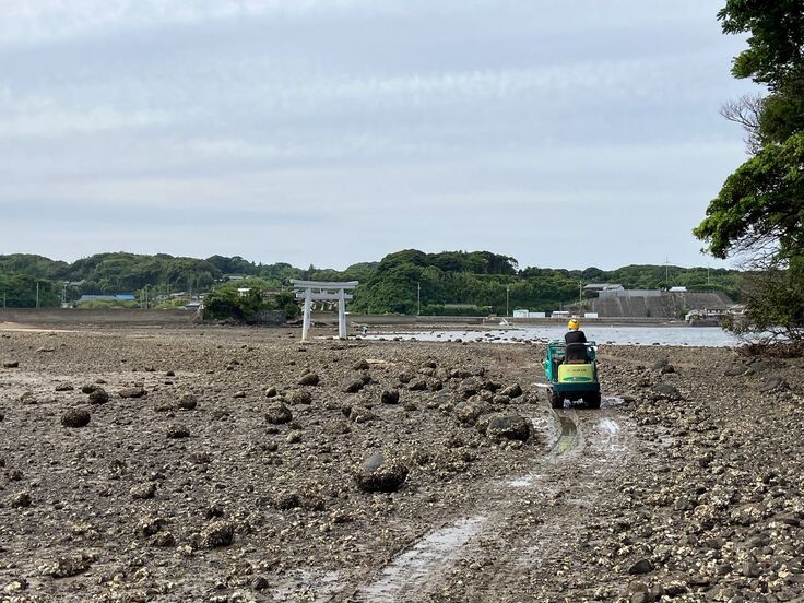 引潮の合間を縫って、月面探査車のような工機(唯一の重機)が資材を運んで何度も往復しています。