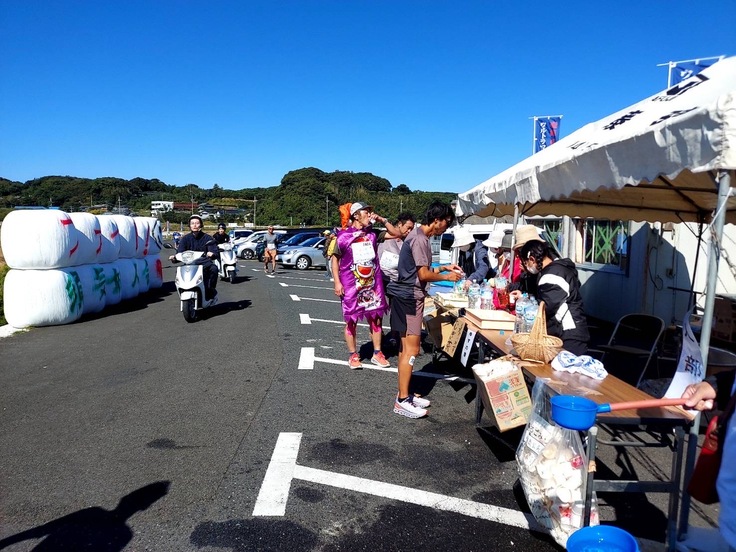 秋の「壱岐ウルトラマラソン」では須気公民館のみなさんがボランティアエイドステーションでランナーに小島さんパワーを注入されます。