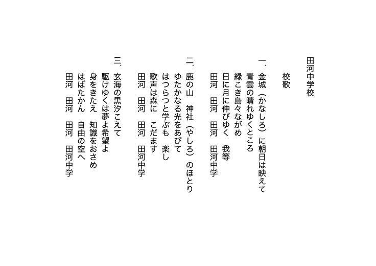 2004年(平成16年)島内4町合併による壱岐市誕生に伴い「壱岐市立田河中学校」に改称。