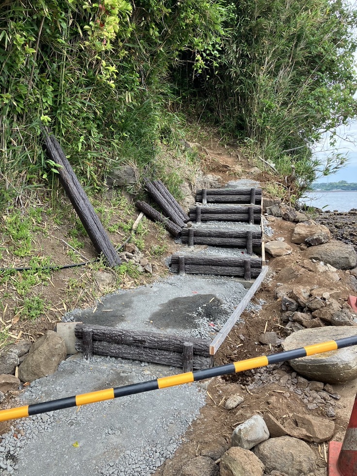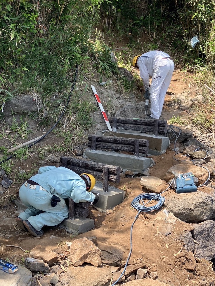 梅雨期間中の事故発生を防ぐため、多雨になる前に少しでも工程を進めたい。潮が引いて島に渡れる時間を縫って作業が続いています。