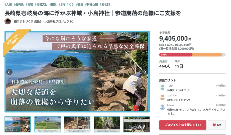 本プロジェクト「長崎県壱岐島の海に浮かぶ神域・小島神社|参道崩落の危機にご支援を」に多大なる応援・ご支援を賜り、改めてありがとうございます。