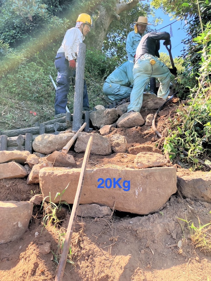 重さ20kgの大きな石は急な斜面を男3人がかりで運んだ