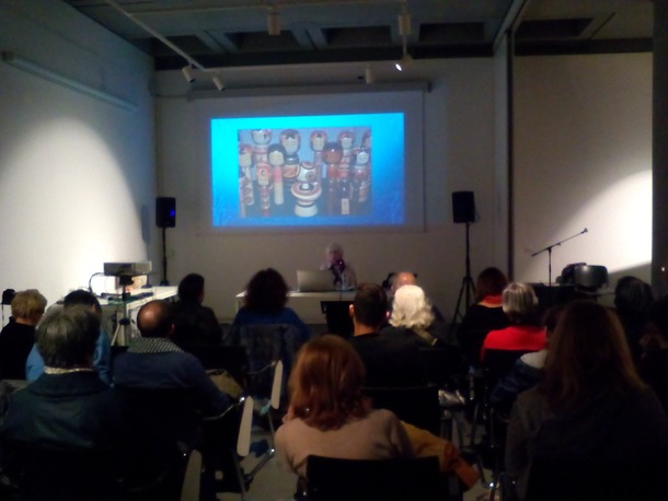 「こけしの旅」と題し、オルシさんはこけしの歴史や東北地方の概略、こけしの系統などについて解説し、また、近年の《こけ女》ブームや遠野のオシラサマにも言及しながら、こけしをめぐる状況を紹介。子供たちも興味深そうにおとなしく見ていました。
