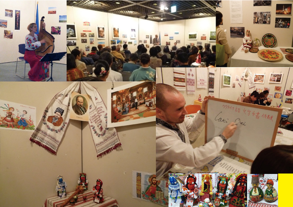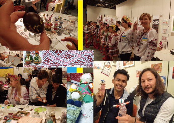 2日間に渡って、ウクライナの写真展や、歴史や伝統を知り、体験できるクイズやワークショップ(エッグペインティング、モタンカ人形づくり、刺繍、文字の紹介など)を行いました。また、ウクライナ舞踊や民族音楽の紹介、民族衣装の体験コーナーなどを設けました。