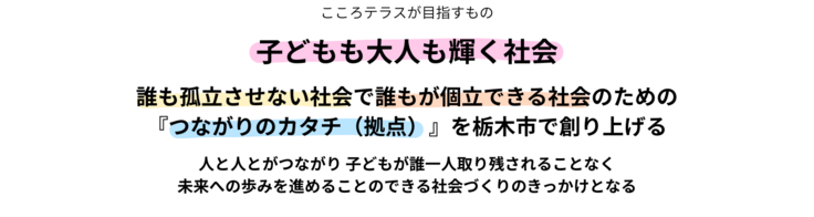 こうした中で、最終的な目的は学校復帰にとどまらす、「社会的自立」にあり、自ら学び、考え、地域や社会と関わりながら生きていく力を育むことが、今後の私たちこころテラスがつくるフリースクールや子どもの居場所の使命だと考えています。