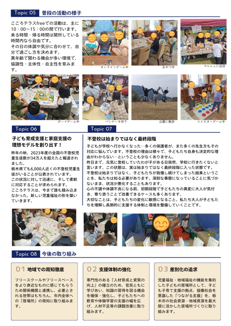 2024年4月栃木市の山間部に位置する地域でフリースクール「こころテラスfree」の営業を開始、2025年4月合同会社として法人成りし事業を継続している。 不登校の児童生徒の日中の居場所として、栃木市内の小中学校との連携を図りながら、子どもたちのサポートにあたっている。
