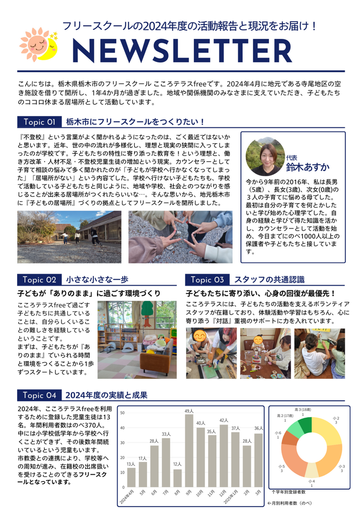2024年4月~任意団体こころテラスとしてフリースクールを開所(1年間でのべ370人が利用)
