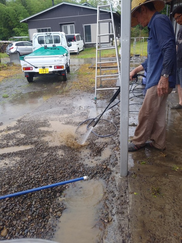 そうそう、今日の作業はお店の前のじゃりの部分から手では抜けない頑固な草がたくさん生えている所を、なんと高圧洗浄機でぶしゅ~~~!っと、砂利をひっくり返し、草の根っこの底まで吹き飛ばす!というもの。