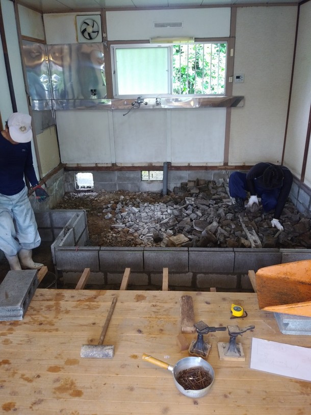 前にアップしたように、床を剥いだ状態からまず厨房になる所の範囲までブロックを積んでもらいました。