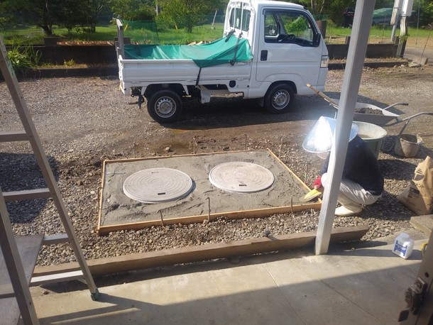 あと、外構工事をしてもらうのに、砂利を足してもらうので、今より大分高くなってしまうという事で、左官屋さんの芝さんに浄化槽の入り口を少し上げてもらいました。芝さん、ナイスな帽子をかぶっています^^