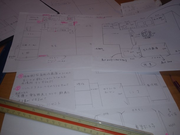 といっても図面なんてちゃんとしたものじゃなく、めっちゃ手書きですが、業者さんによって伝える所も違うので、その度にまたなるべく伝わるようなものを用意します。始めに考えてる時から何十枚も書いては書き直したり、厨房器具も最終的に一つ増やしたものもあるので、また厨房の図面を書き直しました。一番はじめに考えていた時は厨房にする場所も全然違う部屋を考えていたりして、かなり時間をかけてしまいました。