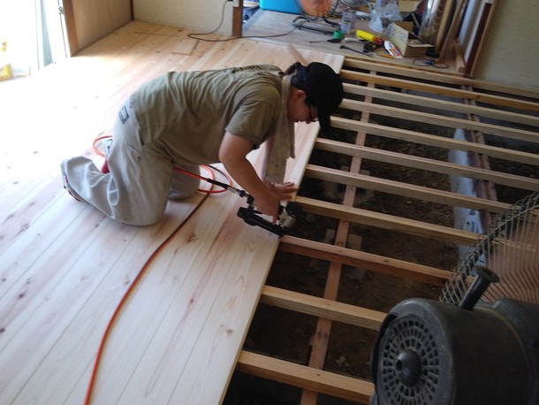 その後は、コンクリを一輪車で運ぶのに通った部屋の床を貼っていきました!