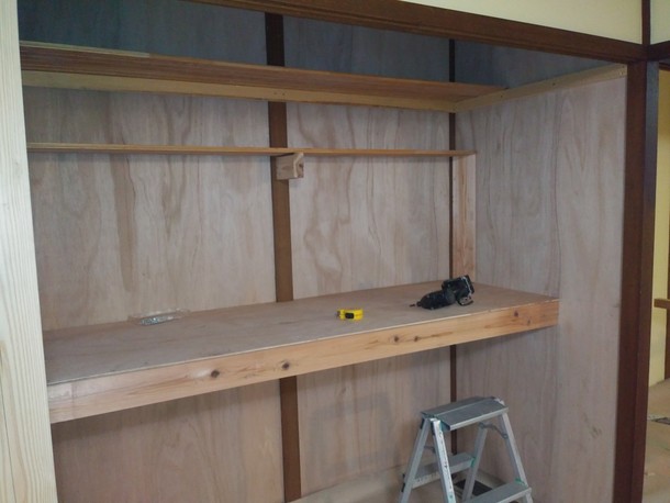 私が手伝える感じじゃなかったしまだ貼ってない所の壁紙はまだ届いてなかったので、「私何しましょうかね?」と言ったら、「押し入れの棚作ってみる~?」と言ってくれたので、「え!そんなんしていいんですか!?」やった~~!という事で、大工見習として(今は完全に大工モードなんで^^)ちょっとワンステップ上がったような気持ちになり、嬉しくなっちゃいました!