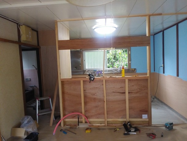 そして、それも貼り終わった時に、お父さんが厨房と客室の間の壁を作ってくれていました。