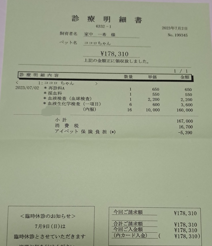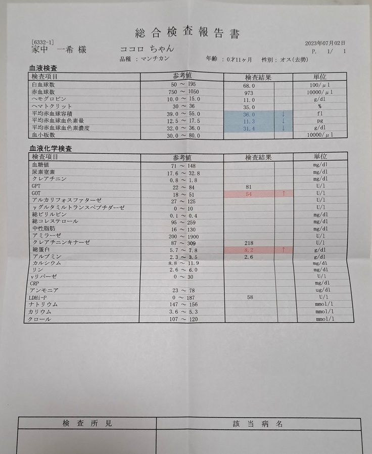 24日目には朝からいつもの投薬治療と病院に診察に行きました。血液検査を行って経過は順調そうです。若干体重が増えたみたいで800g重くなっていました。何はともあれココロ自身も元気なので安心してます☺️