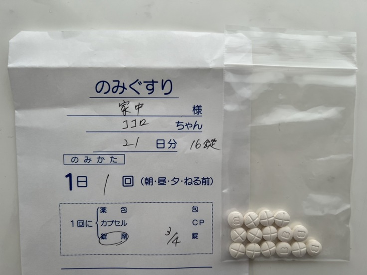 ココロは毎朝決まった時間にお薬をのんでいます。今、体重が2.8キロなので3/4錠が飲む量です。