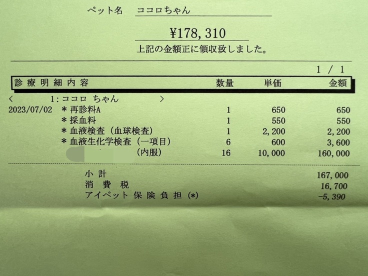 他にFIPと分かるまでの検査費や注射代(お薬服用前に注射を4回しました)、定期的な検査が必要になります。