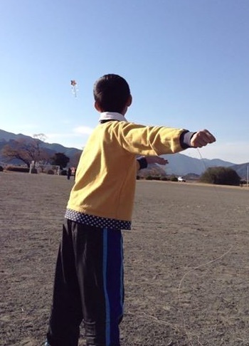 (2013年御正月。初の凧揚げに夢中になる小学生。)