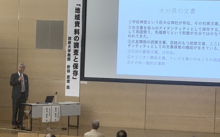 テーマは「地域の文化資源としてのアーカイブズ」で、別府大学特任教授の飯沼賢司氏による「大分県における前近代史料残存の特色」、同大学教授の針谷武志氏による「地域資料の調査と保存」という2本の講演が行われ、市民の方々を含む約50名が参加しました。