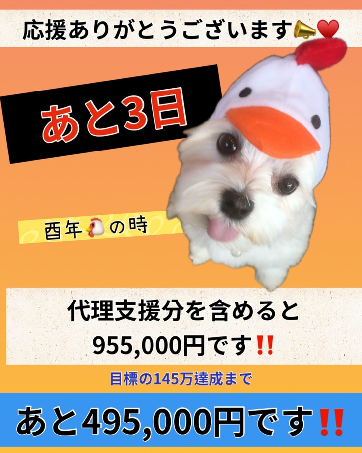 大変心苦しいのですが、診察代・薬代で精一杯な状況な為、リターンにかけられる資金がなく、感謝のメールと活動報告をさせて頂きたいと思っております。