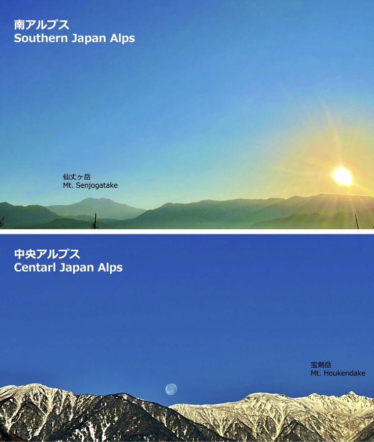 南アルプスから昇る太陽と中央アルプスへと沈む月が同じ瞬間に見れるんです。