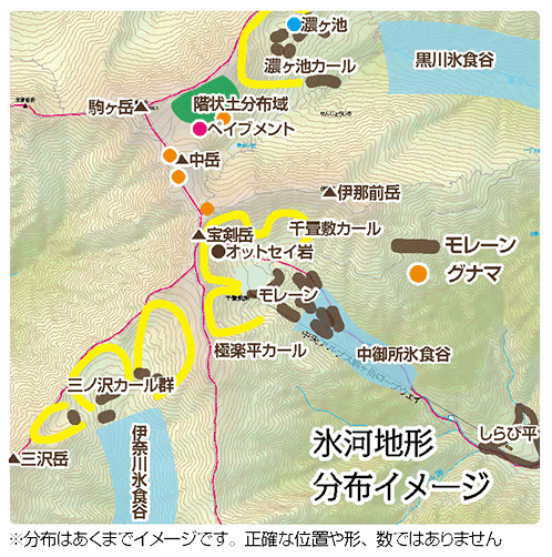 千畳敷カール、極楽平カール、濃ヶ池カール、摺鉢窪カールなど