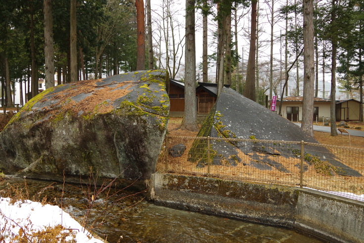 七名石のひとつ、切石の直下には活断層があり、地盤の山側が高くなっている。