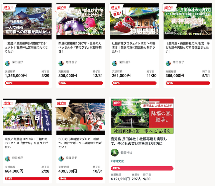 元々は神社紹介ブログの企画で神社様への寄付活動を開始し、2022年秋からはこのREADYFORさんにて、プロジェクトも手掛けるようになりました。その結果、5年で1000万円を超す奉賛金を集めるお手伝いをさせていただいております。