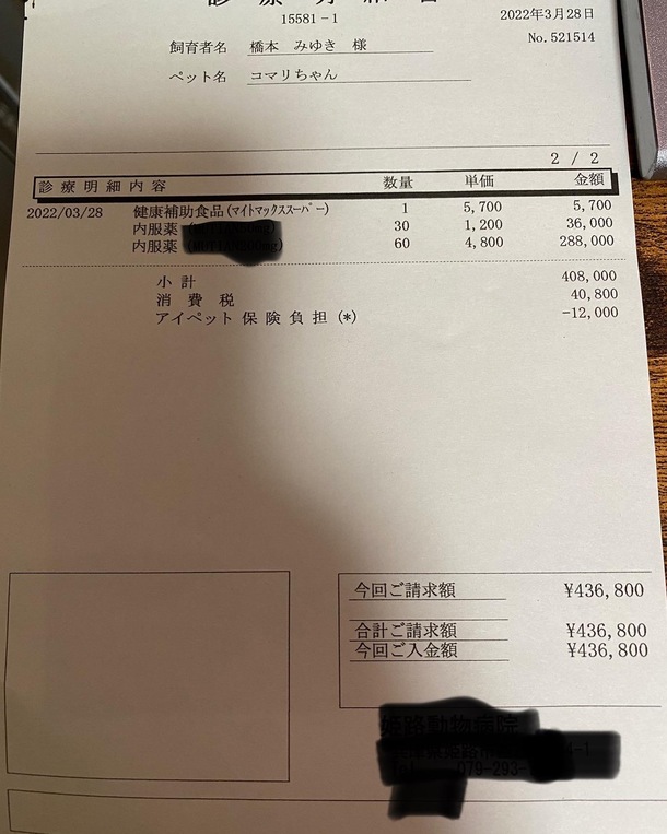 これに先程お送りした特効薬以外のお薬、診察代、定期検診代等を含めて140万円に設定させて頂きました