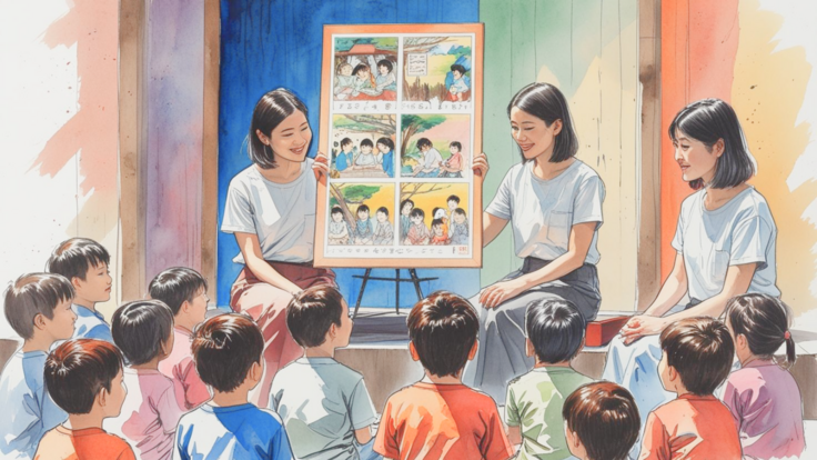 教育現場には電子機器ばかりが増えていくなか、日本の伝統的な紙芝居は、そこに“劇場”をつくることができる。
