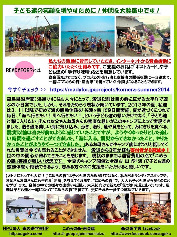 Before the disaster, it was part of a daily life for the people who live in the coastal area of Fukushima Prefecture to play in the Pacific Ocean spreading afar in front of them. But they hesitate to do so to this day. During the summer in 2013, we organized a 9 day-long ocean experience at “Sadogashima Island” in Japan Sea, the first camp at the sea after the 3.11 disaster. As the summer was approaching, the children were getting anxious to get to the sea and rivers, and the parents also wished to soak in the ocean with the children. This summer camp made it possible for them. They jumped into the beautiful clear ocean water, swam, dived, caught fish and shellfish, and ate rice balls. “All this was normal before. Finally I was able to relax and have fun. To get in the ocean. I had not done this since the disaster. Finally I was able to do one of the things I had been wanting to do.” A mother murmured at the end of the camp. I cannot forget her words. After three years, the number of donations has gone down by 80%!. The public is losing interest. With this current situation, we won't be able to continue to operate “Komera's Woods” simply from a financial standpoint. We would be most grateful for your concern and support, so that the children can continue to have moving experiences in the mountain and the sea, this summer and for the coming years.