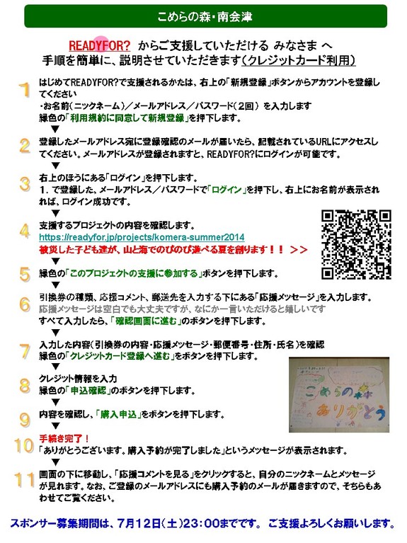 This is an online tool that enables you to contribute funds in support of our program via internet. In return, supporters will receive “postcards”, “hand-made” miso made by children, or some other items. We also want to go beyond fund-raising, and encourage our supporters to become “collaborators” to grow “Komera's Woods in Minami Aizu” together by deepening the relationship between us and you the supporters of our program.