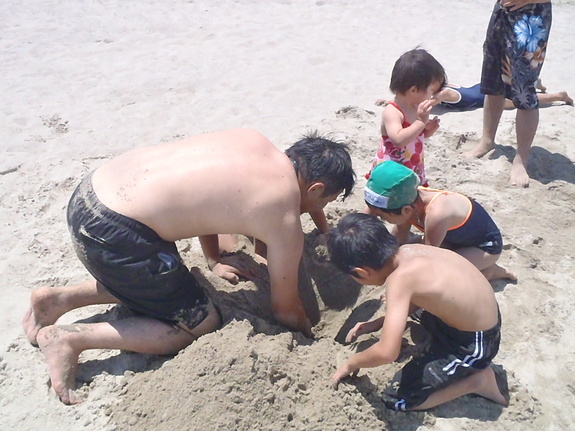砂浜で穴掘り大作戦!2013年夏休みの佐渡にて。