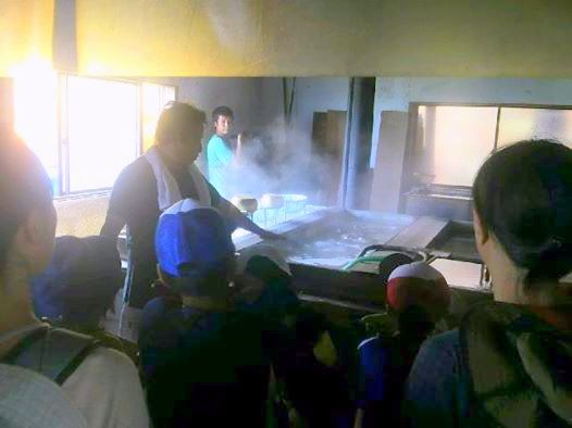 昨日泳いだ海とは反対側の海を眺めながらバスに揺られ、工房に到着。あいさつをしてから、工房を見せていただくことに。工房の方に塩作りの工程を伺って、実際に釜を見せていただいた。釜は3層にわかれていて、薪をたくさん使うこと、不純物を取る作業が欠かせないことなど美味しいものには手間ひまがかかっていることを感じた。