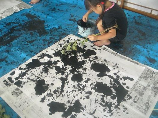 たたみ半畳分もある大きな和紙に 拾ってきた草木等で
