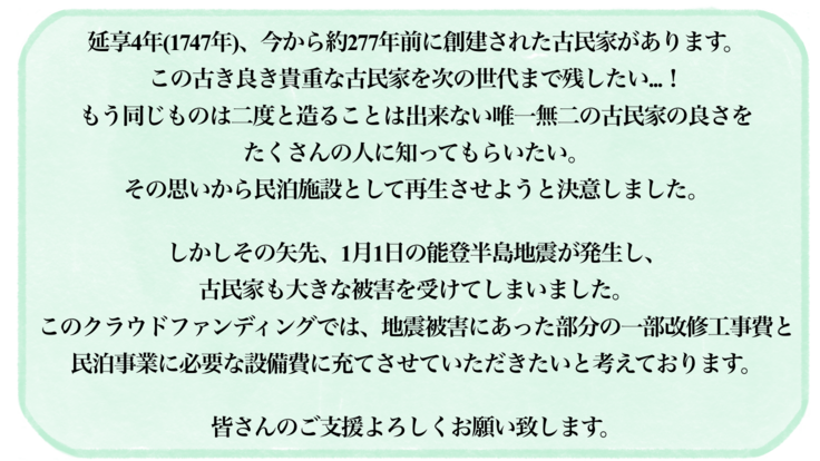 新潟県糸魚川市の滝川原集落にある築277年の古民家をリノベーションして、民泊施設としてのオープンを目指します。 1月1日の能登半島地震で被害を受けた部分の修繕・改修費200万と民泊事業に伴う設備品の購入に100万円を充てたいと思います。