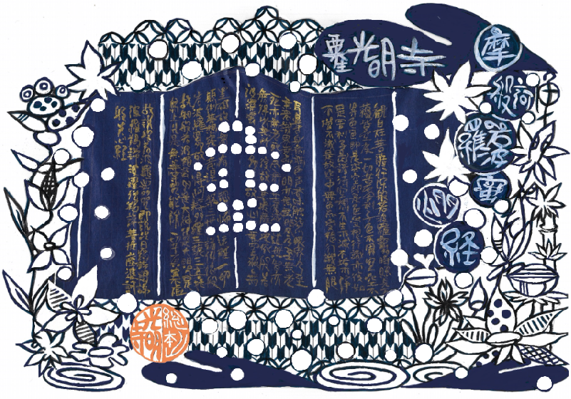 朱印に描かれるは、お経の中でも広く人々に知られる「般若心経」。中央には般若心経で説かれる「空(くう)」(色即是空...等)が浮かびるようにしました。