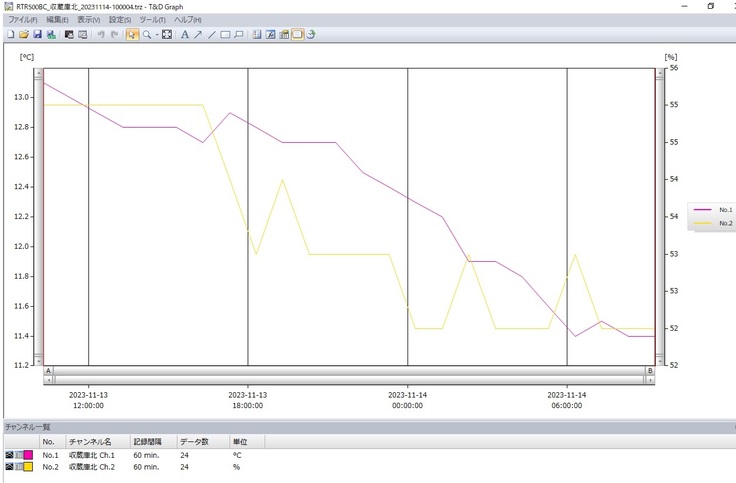 現在宝物庫ではデータロガー(温度・湿度を測定し、測定したデータをパソコンに飛ばす機器)を設置し、宝物庫に行かなくとも即時にパソコンで測定結果が分かるようにしています。