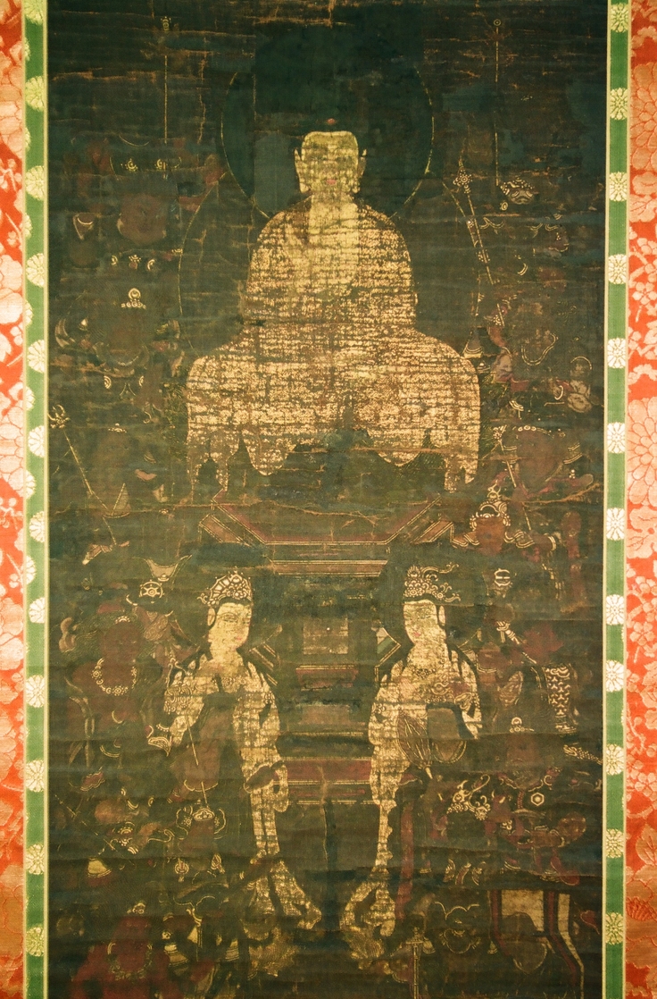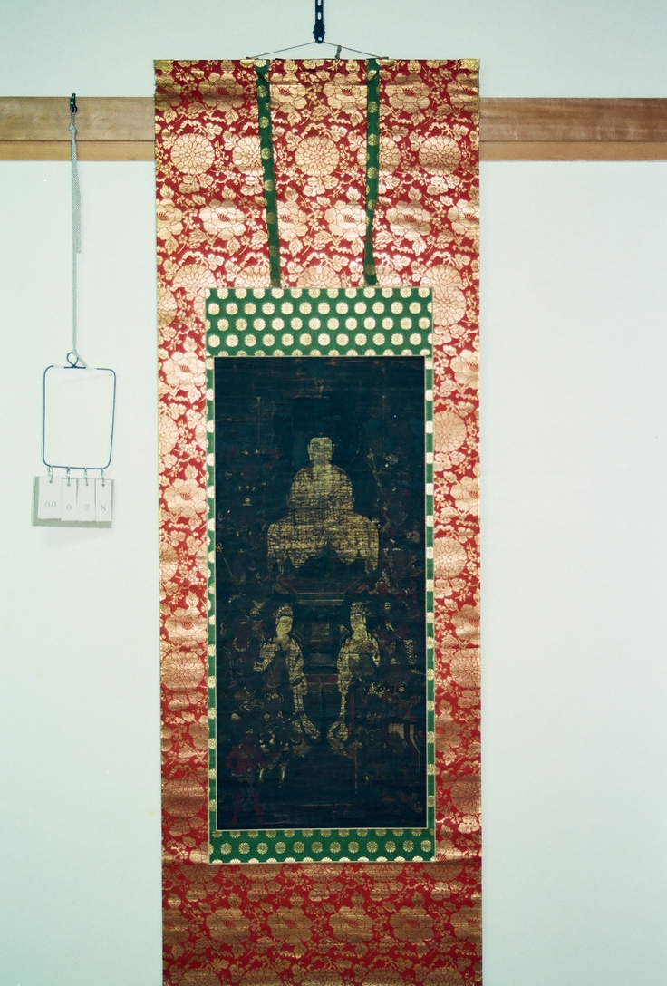 釋迦十六善神図は文化財指定こそされていませんが、鎌倉時代※絹本着色作の大変貴重な軸です。損傷があり修繕の必要がありますが、指定を受けていない為補助金の対象にならず修繕を見送っています。※絹本着色(けんぽんちゃくしょく)絹のうえに染料で着色されたもの。