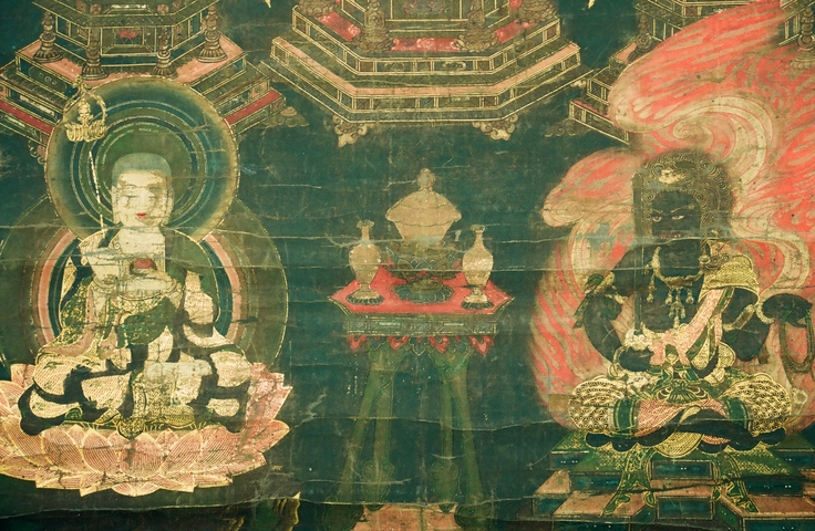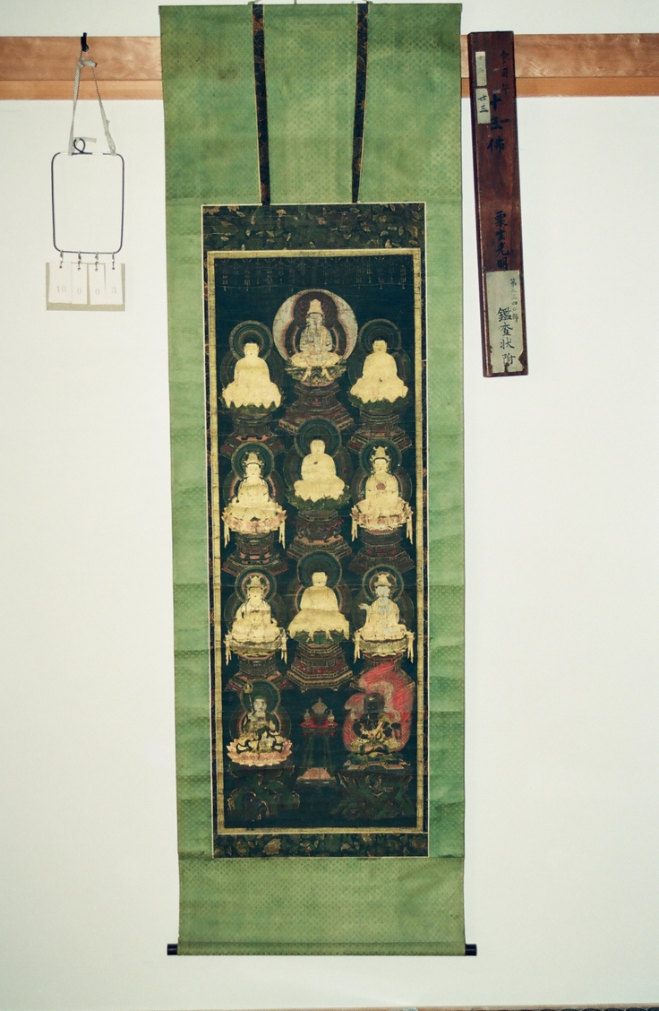 本日ご紹介する宝物は南北朝時代に絹本着色で描かれた十一尊図です。こちらも未指定となっていますが、現在は京都国立博物館へ寄託しております。折れが多数ありこちらも修繕を必要とします。修繕後は光明寺にて管理できるよう、今回の改修をしっかりと成し遂げる決意です。