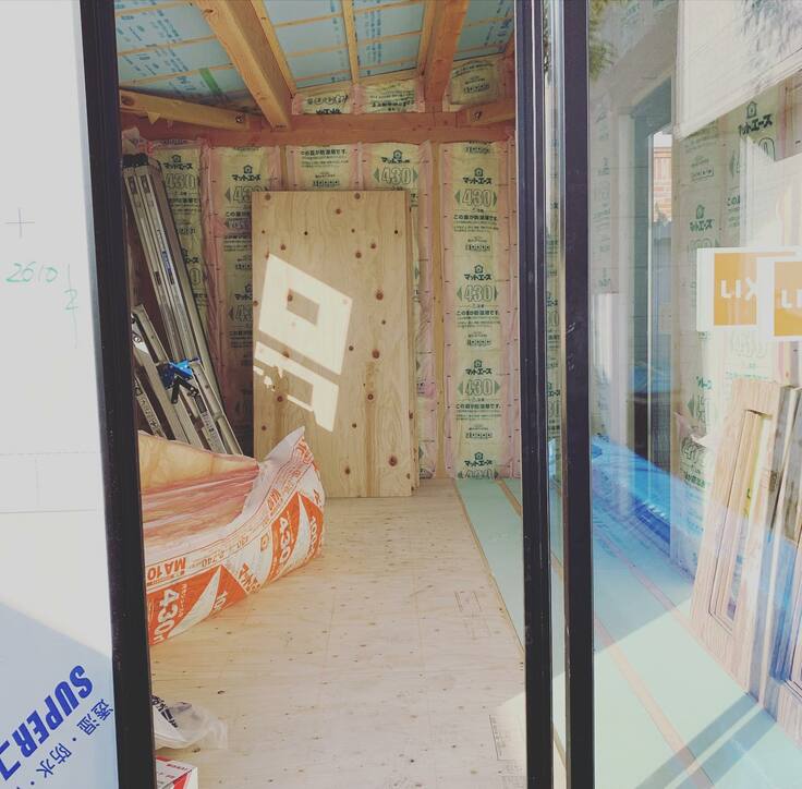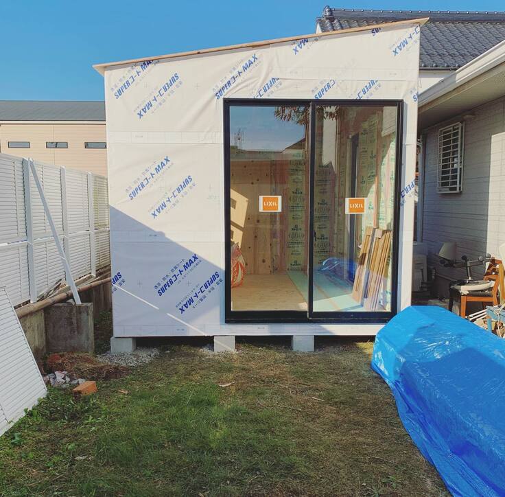 計画当初は、正面から見て横長の建物で奥行きが短い長方形の予定でしたが、庭の広さ的に無理だったので置く向きが変更。奥行きの方が長い長方形になりました。6畳なので知れてるけどそこそこの広さです。