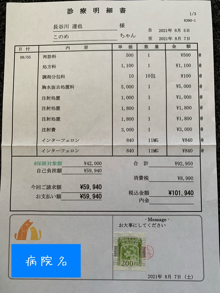 水が溜まった原因は、検査をしないとわからないが、膿胸かFIPと言われました。