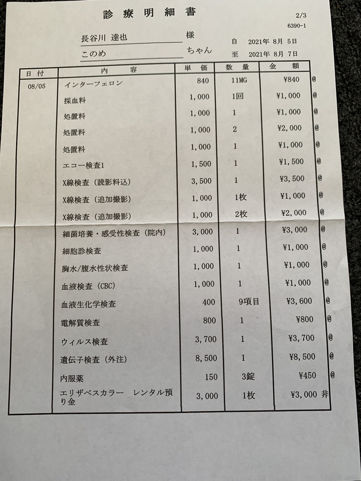 この日から毎日の投薬、胸水除去、2週間毎のステロイドとインターフェロンの注射が始まります。