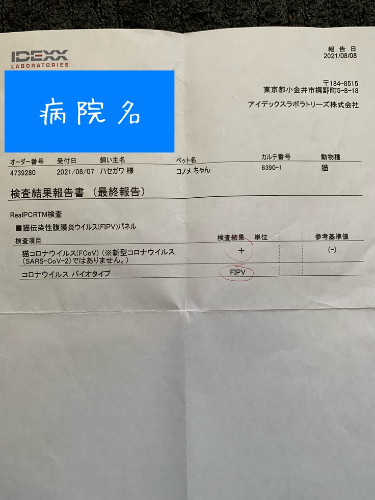 検査結果が出るまで数日かかりますが、膿胸の場合胸水を培養するとウイルスが増殖するらしいのですが、ウイルスが増えない為、先生は膿胸ではなく、可能性が高いFIPとして治療していくと言われました。