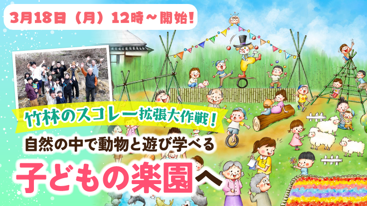 その建設費用や古民家の修繕費、竹林のスコレー拡張に伴う運営費用を募るため、クラウドファンディングを行います。
