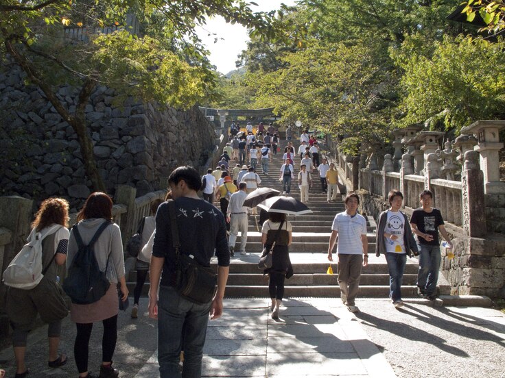 ご参拝の皆さまは、ご自分の思いを胸に、御本宮を目指してこの長い長い石段を登ります。特に、海の神様として信仰されていますが、ご参拝の方々は、家内安全、商売繁盛、交通安全、学業成就、心願成就と様々なお願い事を祈られます。