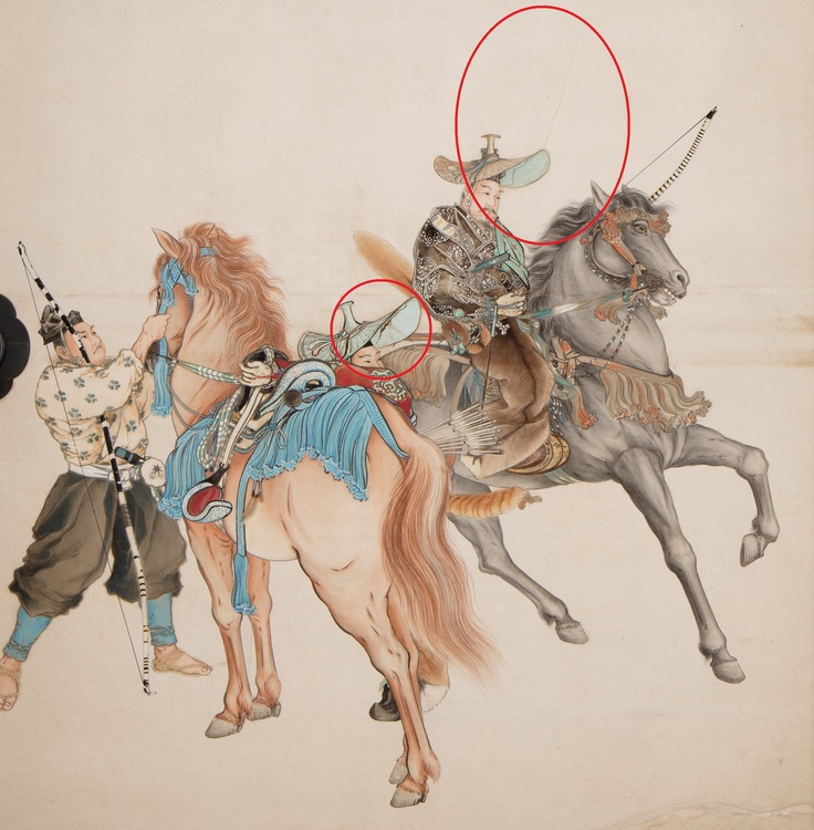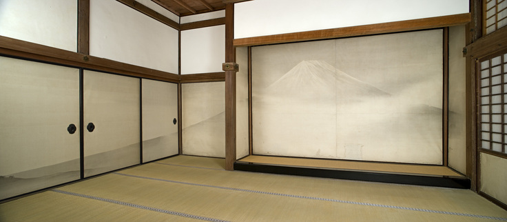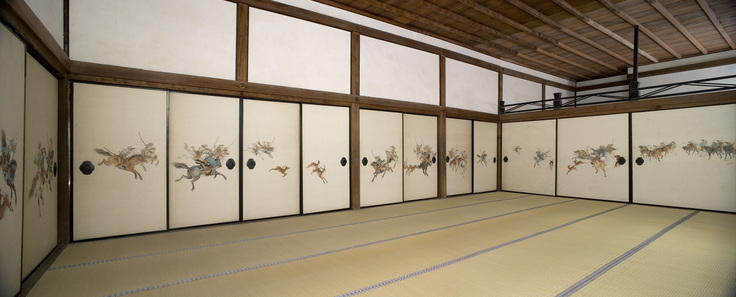 「水呑みの虎」で有名な円山応挙の障壁画の背面に位置する2部屋に描かれた作品です。「曾我兄弟の仇討ち」で有名な、富士山麓での大規模な巻狩をテーマとし、伝統的な大和絵の描法に西洋画の遠近法を取り入れています。明治時代に活躍した邨田丹陵によるものです。