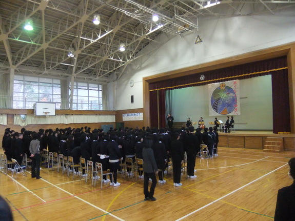 緑ケ丘中学校の「音楽卒業式」は、卒業生と在校生が向き合い、贈る言葉や答辞の間に常に生音楽が演奏され、生徒が歌を歌い、中学生オーケストラ部と京フィルの合同演奏で3年生が巣だって行ったのです。京フィルの演奏者は涙で楽譜が見えないほど感激し、中学生オーケストラ部の子どもたちも「またいつか教えて頂き、また共演したい」と言っていました。
